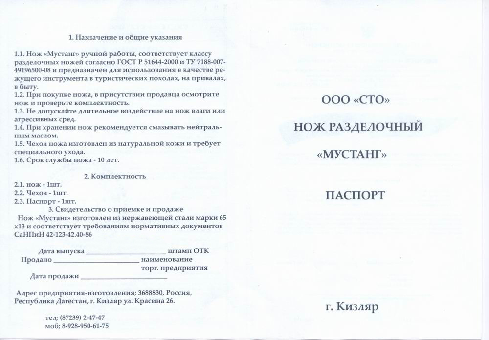 Нож " Мустанг" изготовленный ООО "Сто" (г. Кизляр). Представленный образец является ножом разделочным и не относится к холодному оружию. Соответствует требованиям ГОСТ Р 51644-2000 "Ножи разделочные и шкуросъёмные. Общие технические условия" с изменением №1(86-СТ) от 1 июля 2005г.