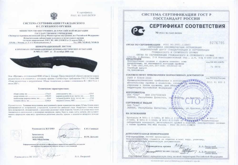 Нож " Мустанг" изготовленный ООО "Сто" (г. Кизляр). Представленный образец является ножом разделочным и не относится к холодному оружию. Соответствует требованиям ГОСТ Р 51644-2000 "Ножи разделочные и шкуросъёмные. Общие технические условия" с изменением №1(86-СТ) от 1 июля 2005г.