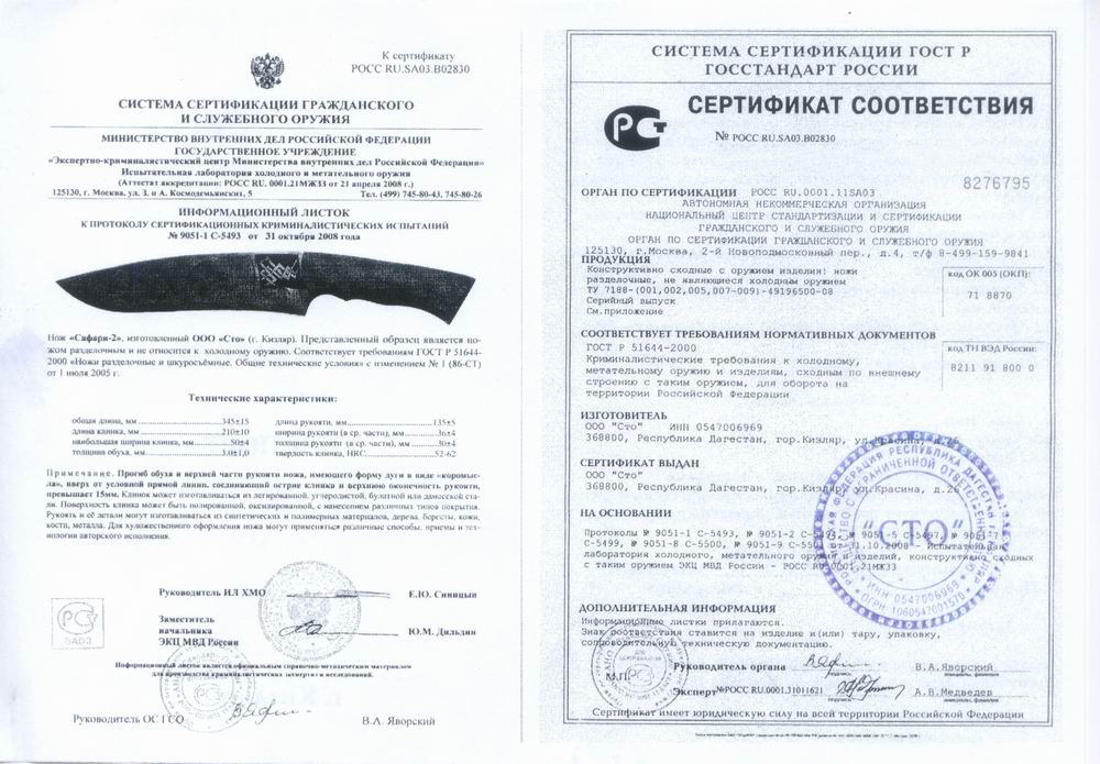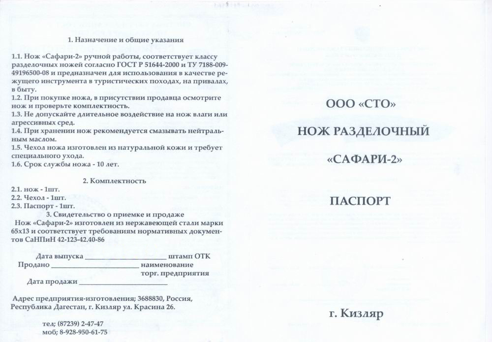 Нож " Сафари -2" изготовленный ООО "Сто" (г. Кизляр). Представленный образец является ножом разделочным и не относится к холодному оружию. Соответствует требованиям ГОСТ Р 51644-2000 "Ножи разделочные и шкуросъёмные. Общие технические условия" с изменением №1(86-СТ) от 1 июля 2005г.