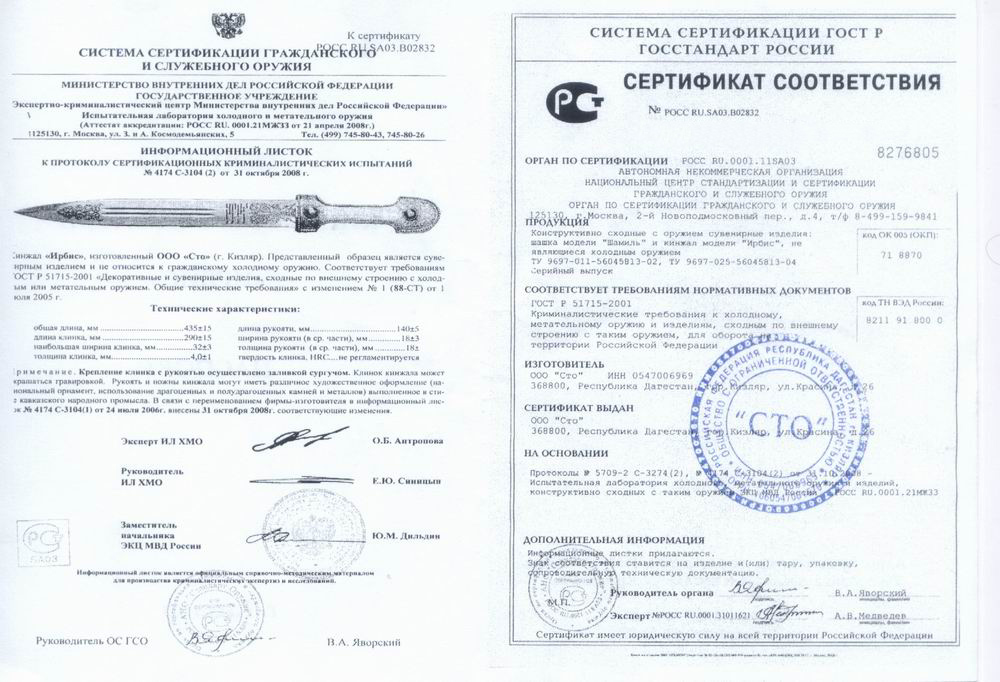 Кинжал "Ирбис", изготовленный ООО "Сто" (г. Кизляр). Представленный образец является сувенирным изделием и не относится к гражданскому холодному оружию.